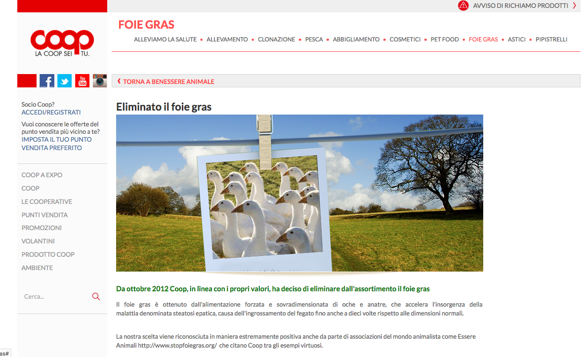 SPIEGATE?? C'è scritto:"La nostra scelta viene riconosciuta in maniera estremamente positiva anche da parte di associazioni del mondo animalista come Essere Animali http://www.stopfoiegras.org/ che citano Coop tra gli esempi virtuosi."